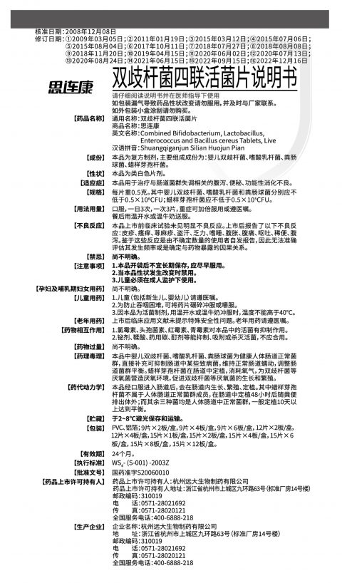以下為杭州遠(yuǎn)大生物制藥有限公司生產(chǎn)的思連康(雙歧桿菌四聯(lián)活菌片)最新產(chǎn)品說明書2022年12月16日修訂版;